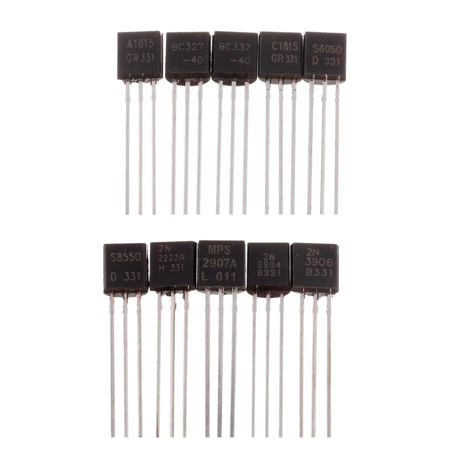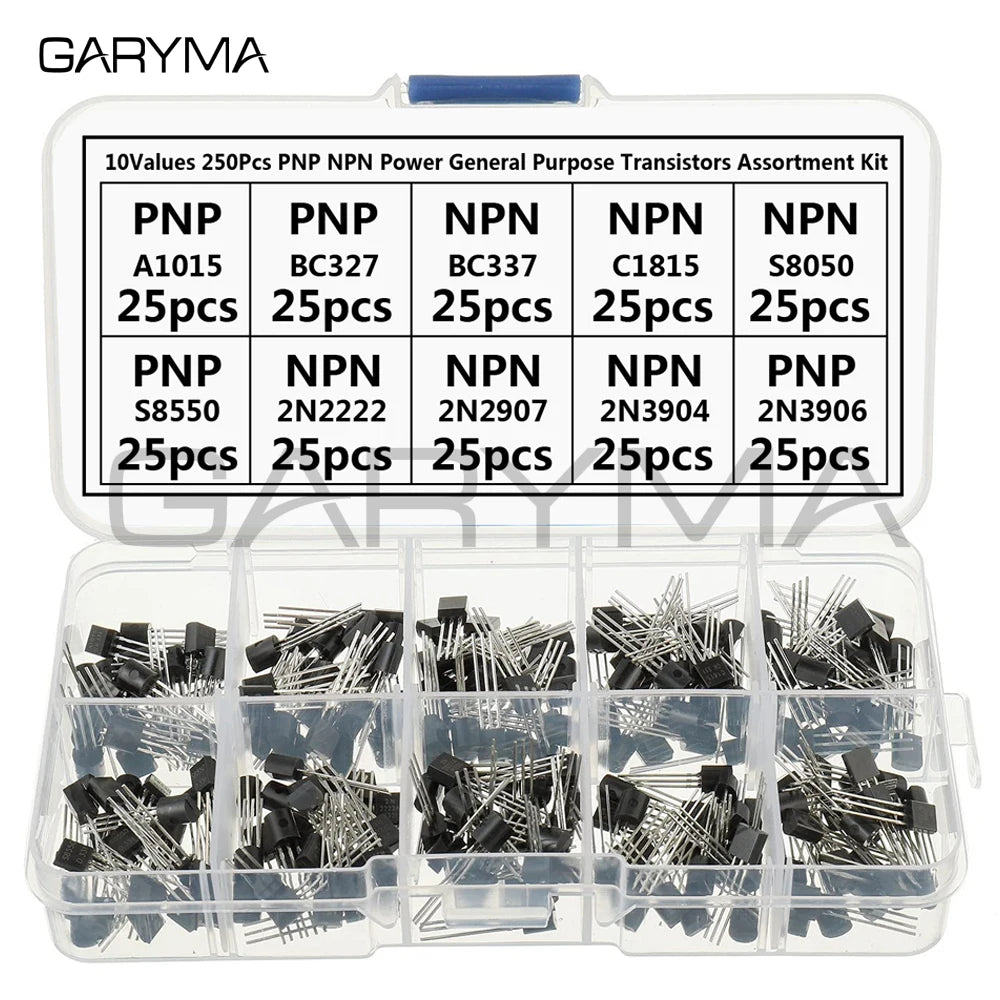 10 Values 250 Pcs A1015 BC327 BC337 C1815 S8050 S8550 2N2222 2N2907 2N3904 2N3906 PNP NPN Power Transistors Assortment Kit